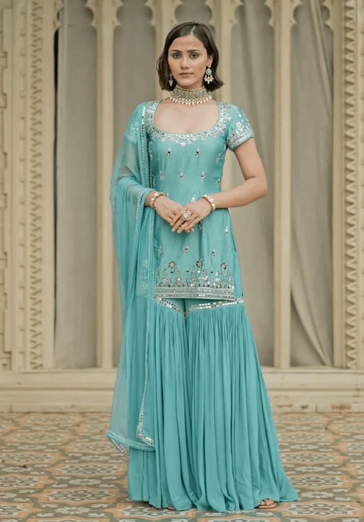 Today, designers create sharara suits with mirror work, thread work, gota patti, and heavy embroidery. Bollywood actresses also promote this style by wearing such outfits at events. The sharara suit has become a fashionable and popular dress in modern times. It represents a beautiful blend of tradition and modern style. When women wear this outfit on special occasions, it enhances their beauty and confidence.